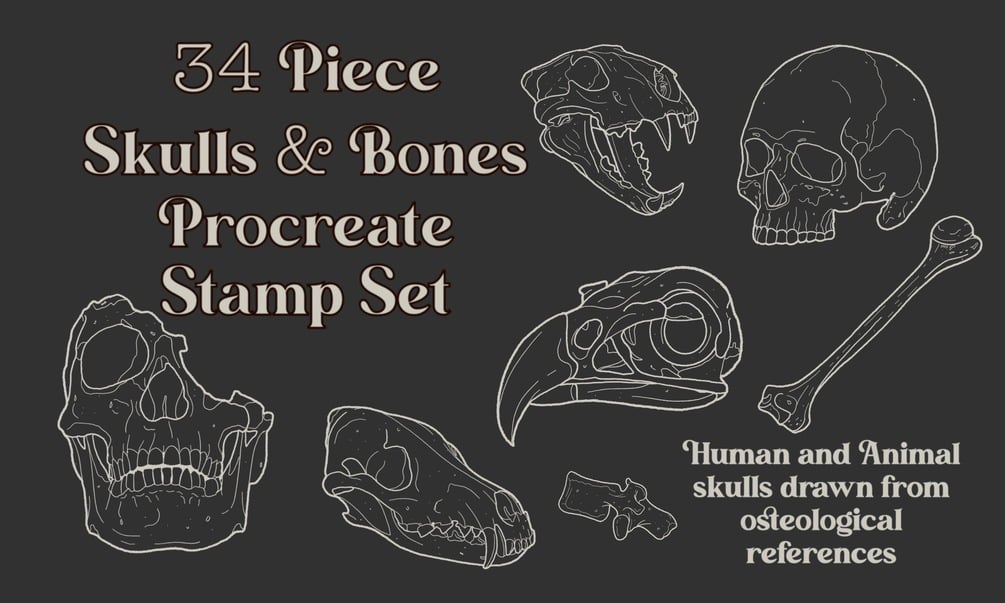 34 piece Skulls & Bones Procreate Stamp Set! Use alone or with my other stamp sets to create unique illustrations and compositions! I use my stamp packs to build the bases of my illustrations and the tattoo designs I create.