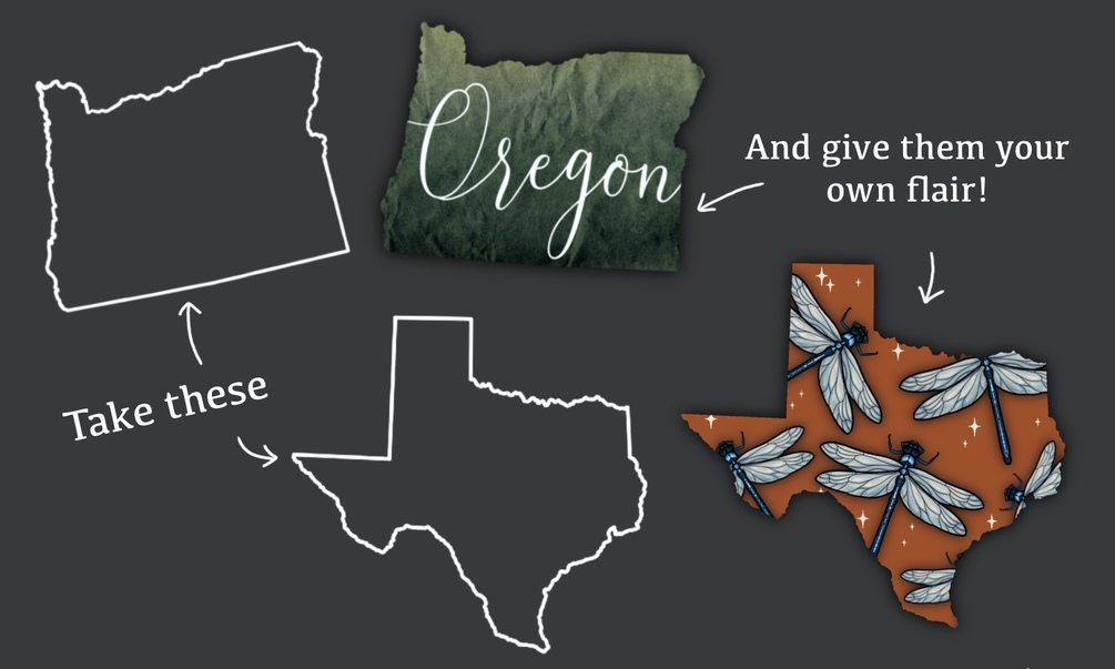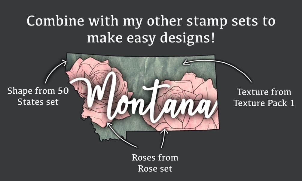 Combine with my other brush/stamp sets to quickly and easily create your own custom designs! In my example illustration of Montana (above), I used this stamp set for the shape; Texture pack 1 for the texture; and my rose stamp set, all of which are currently available for purchase in my store.
