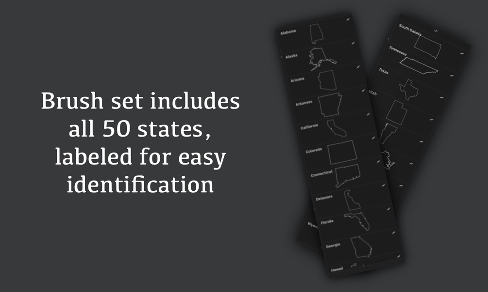 Procreate Stamp set featuring outlines of all 50 United States. from Alabama to Wyoming! I made these to use as a part of a larger project to make state themed designs, click on the right side of the cover to advance to previews of how I'm going to use these stamps!