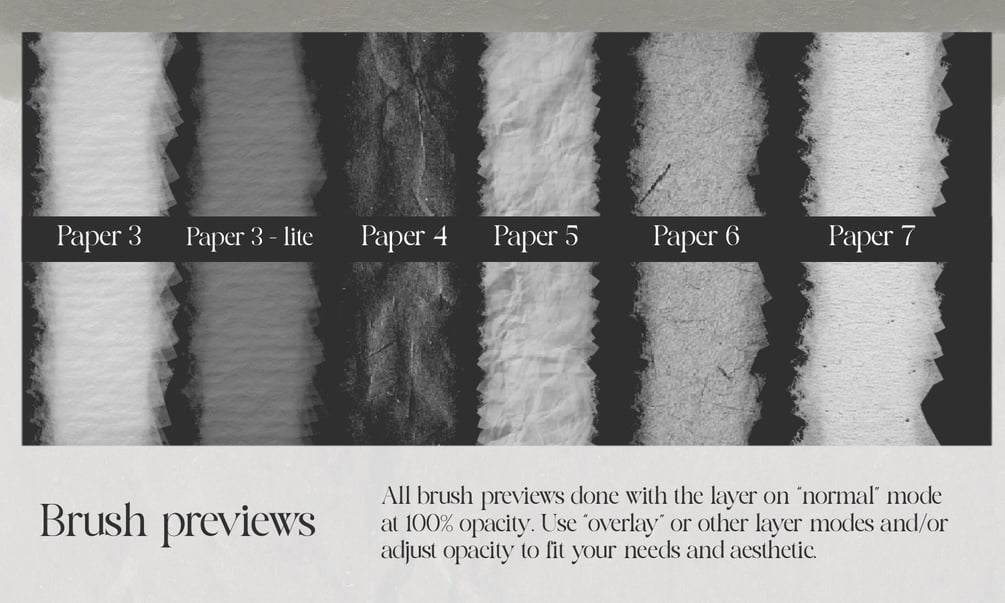 Textures vary in opacity - some are more translucent and some are more opaque. Paper textures also include crumpled paper to add variety. Use these textures and play around with the layer blending mode to fit your needs and aesthetic.